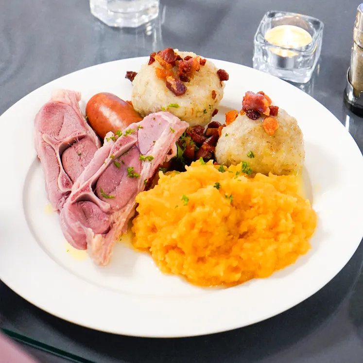 servert med saltkjøtt, vossakorv, kålrabistappe og baconfett